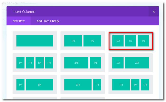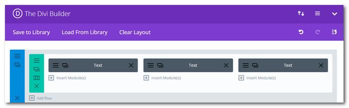 Далее запускаем Divi Builder и в стандартной секции создаем ряд состоящий из четырех или трех (если на сайте используется сайдбар) колонок.