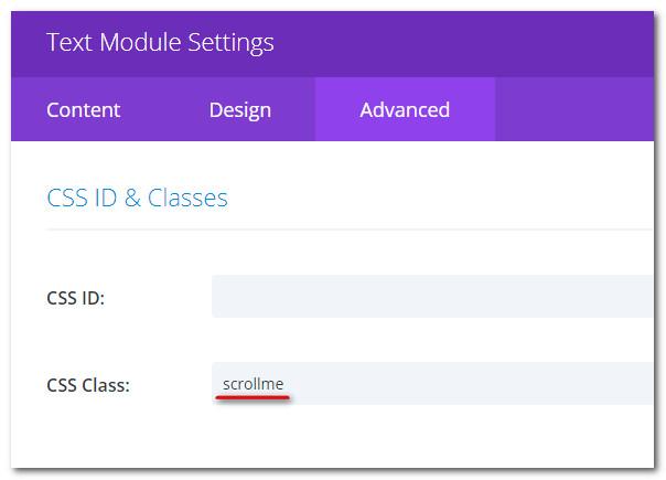 На вкладке Advanced каждого модуля, в поле CSS Class, прописываем класс scrollme.