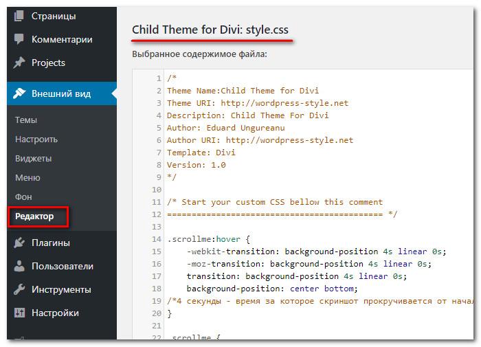 Для вставки кода из панели управления Вордпресс перейдите в меню Внешний вид -> Редактор и справа выберите для правки файл style.css.